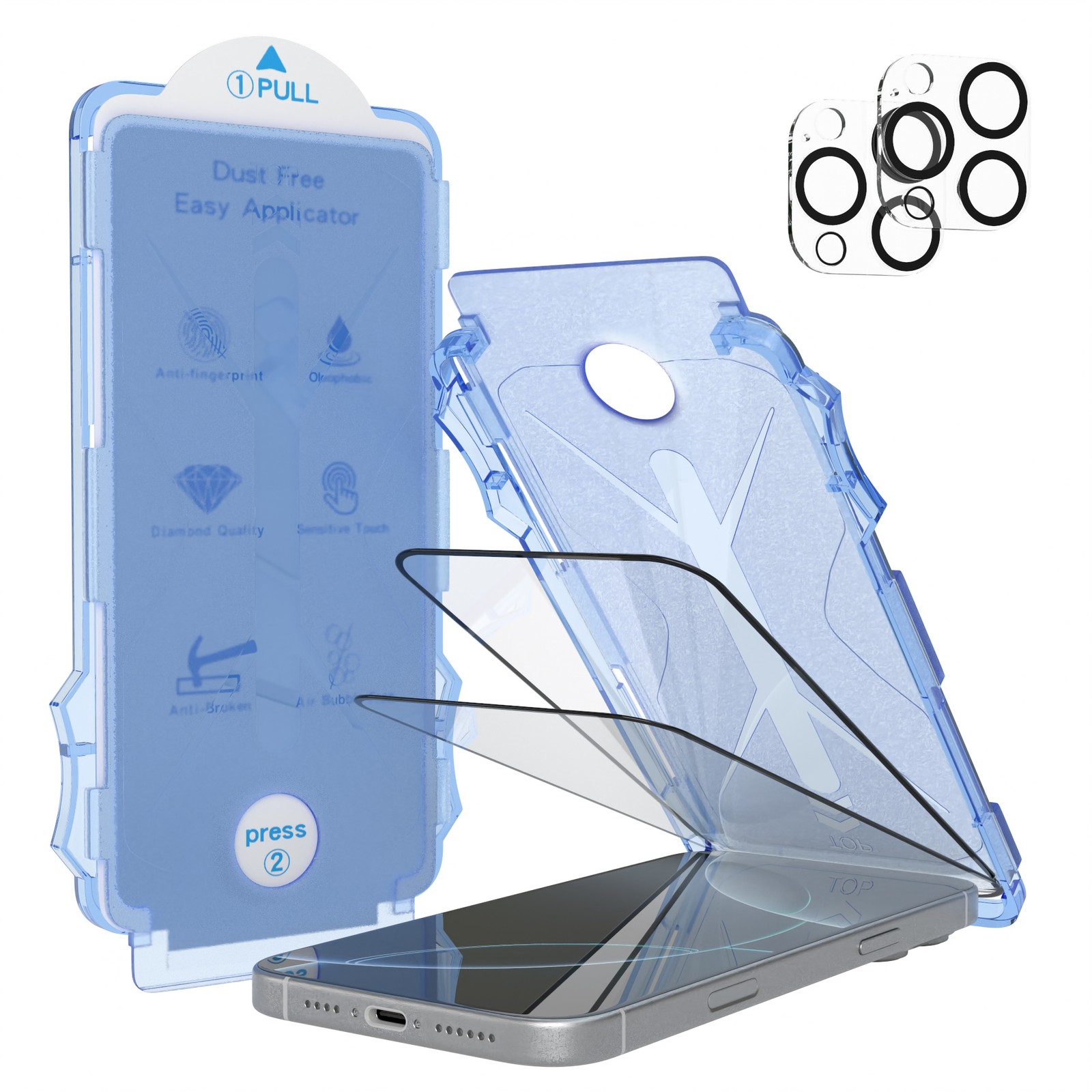 Sichere dein Smartphone mit unserem Displayschutz-Set! 2x Magic Screen Boxen mit klarem Schutzglas, Kameraschutz für Nachtfotografie, mühelose Blasenfreie Montage, 9H Glas (0,03 mm), Anti-Fingerabdruck, No Notch Design. Inkl. Reinigungsset. Bestelle jetzt für ultimativen Schutz und stilvolles Design! Displayschutz für iPhone 15 - Displayschutz für iPhone 15 Plus - Displayschutz für iPhone 15 Pro - Displayschutz für iPhone 15 Pro Max .