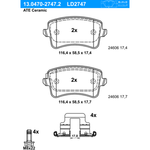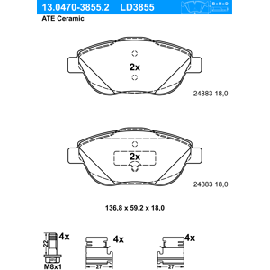 Artikelnummer: 13.0470-2880.2 Hersteller: ATE EAN: 4006633339544 Höhe [mm]: 55,9, Ergänzungsartikel/Ergänzende Info 2: mit Bremssattelschrauben, Bremssystem: Lucas / TRW, Breite [mm]: 105,3, Ergänzungsartikel/Ergänzende Info: mit Zubehör, MAPP-Code vorhanden: , Prüfzeichen: E1 90R-02A0258/0350, Artikelnummer des empfohlenen Zubehörs: 13.0460-0035.2, Artikelnummer des empfohlenen Zubehörs: 13.0460-0259.2, Abmessungen beachten: , Dicke/Stärke [mm]: 17,1, Verschleißwarnkontakt: exkl. Verschleißwarnkontakt, Verschleißwarnkontakt: für Verschleißwarnanzeiger vorbereitet, Anzahl der Schrauben: 4, Fahrzeugausstattung: für Fahrzeuge ohne elektronische Feststellbremse,.