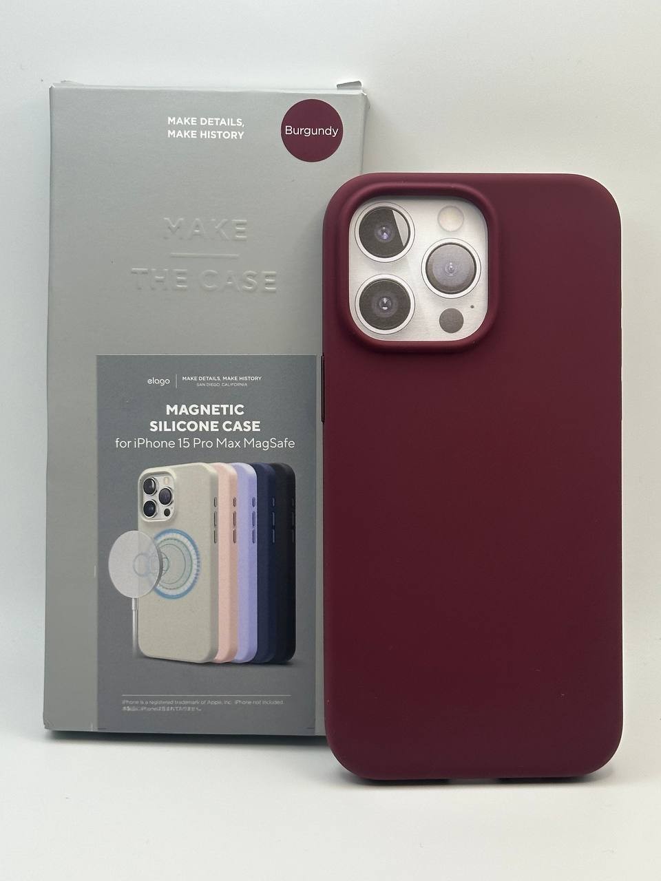**elago iPhone 15 Pro Max Case - Magnetic Liquid Silicone & MagSafe - Burgundy** Elevate your iPhone 15 Pro Max with the elago Magnetic Liquid Silicone Case in Burgundy. This case features **strong built-in magnets** for seamless MagSafe compatibility, ensuring your device stays secure during charging. Crafted from **durable liquid silicone**, it offers **enhanced grip** and **robust protection**, all while adding a vibrant splash of color. With **full coverage design**, it protects all sides, including buttons, and features a **raised lip** to defend against scratches to the screen and camera. Easy to clean and maintain, simply wipe away lint and dust with a damp cloth. Upgrade your phone's style and safety today with this **premium accessory**!.