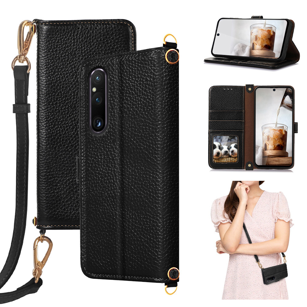 Echtleder Umhängetasche RFID Schutz Magnet Ständer Klapphülle Band Case für SONY