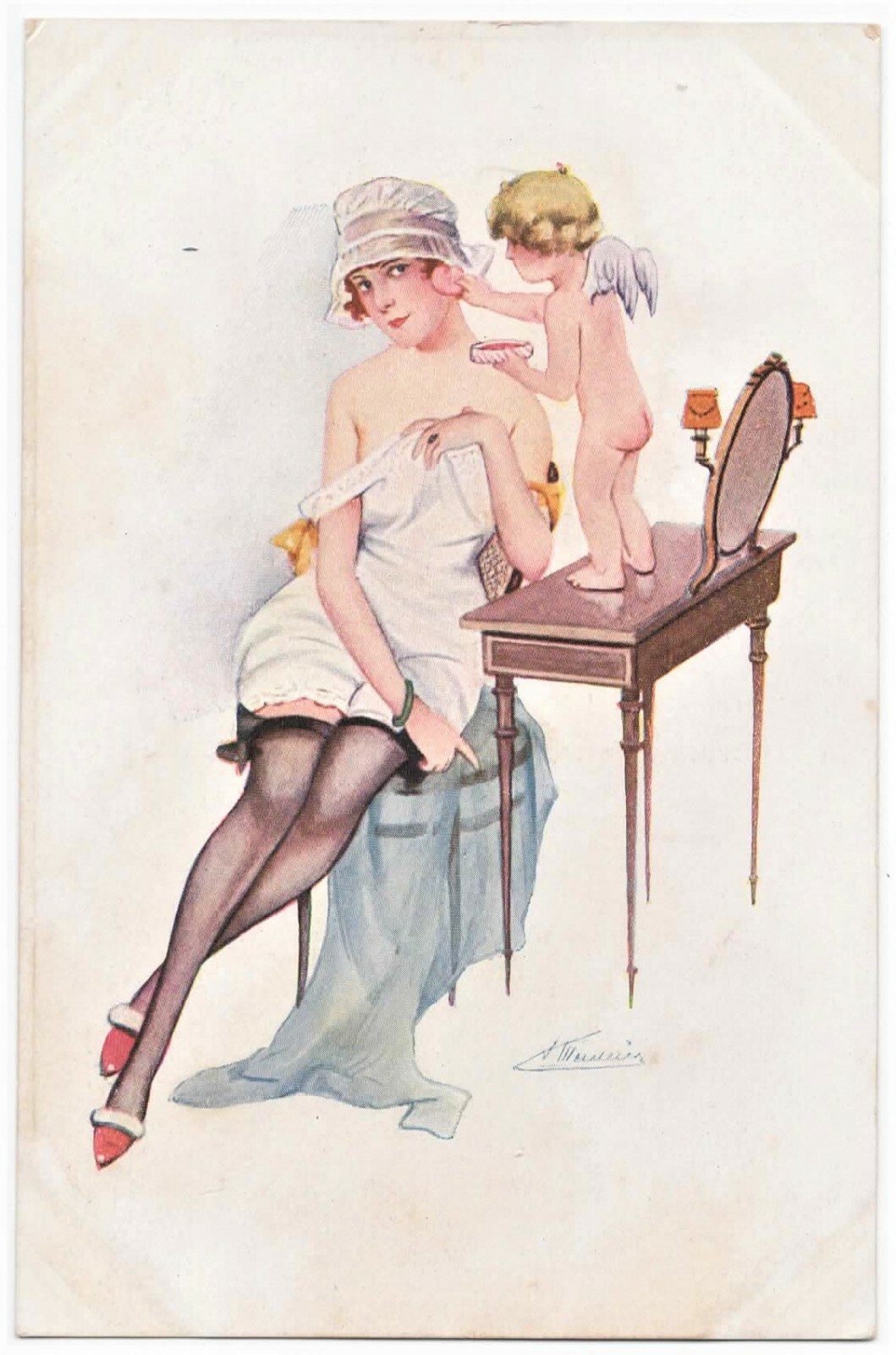 alte Künstler-Ak sign. Henri Meunier, "les fard rose", ungelaufen