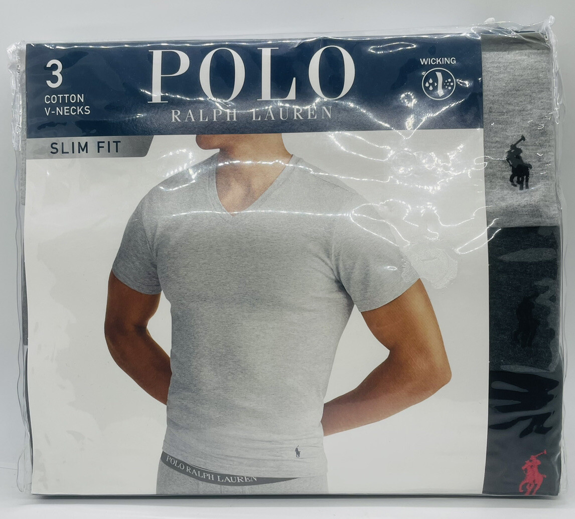 Polo Ralph Lauren Slim-Fit-T-Shirt für Herren mit V-Ausschnitt und Pony-Logo 3 Stück Logo am linken Saum 100 % Premium-Baumwolle Farben: Grau/Dunkelgrau/Schwarz Größe: KLEIN (34 - 36" / 86 - 91 cm).