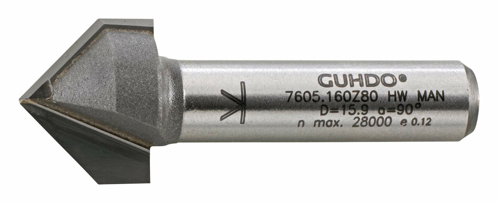 Guhdo HW-V-Nutfräser Z2 S8 D16 90 Grad. 2 HW-bestückte Schneiden. Zum Fräsen von V-Nuten, Ziernuten, Schriften oder zum Anfasen. Für Massivhölzer sowie Holz- und Plattenwerkstoffe. Schaft-Ø 8 mm.