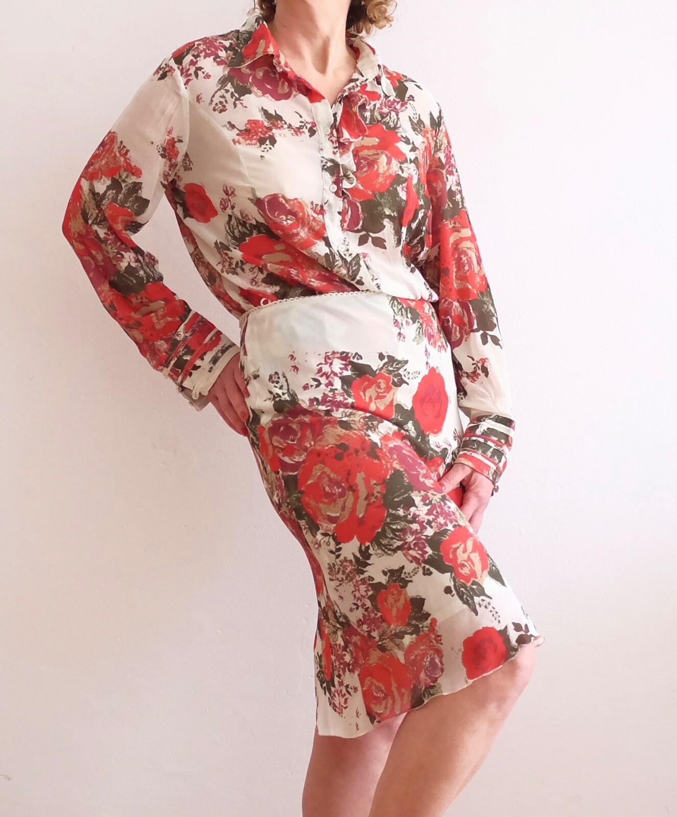 BETTY BARCLAY SPORTS Zweiteiler BLUSE UND ROCK Chiffon mit Blumenmuster weiß-rot