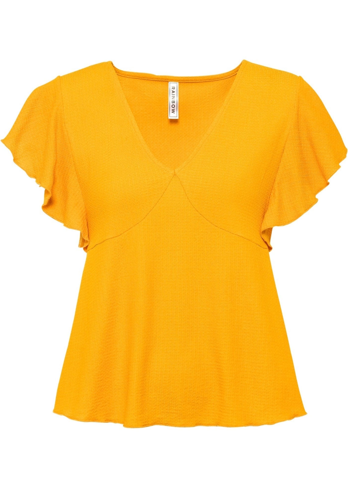 Farbe: Gelborange. Ausschnitt: V-Ausschnitt. Mode muss nicht teuer sein! Die Breite von Achsel zu Achsel beträgt ca. 38 cm. Crepe-Shirt mit Volants. Ausschnitttiefe: tief. Material: Obermaterial: 98% Polyester, 2% Elasthan.