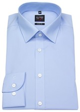 tailliertes OLYMP Hemd mit Comfort Stretch; Kentkragen; Uni-Popeline - Stoff; extra langer Arm - 69cm statt 64cm; Body Fit - stark tailliert; Comfort Stretch: mit Elastolefin-Anteil für optimalen Sitz; besonders bügelleicht; Abnäher im Rücken; schmale Knopfleiste; ohne Brusttasche; gesticktes OLYMP Logo an der Manschette; Schadstoffgeprüft nach Oeko-Tex Standard 100; ; Das OLYMP Businesshemd Level Artikelnummer: 6090 69 18 | Material: 97% Baumwolle, 3% Elastolefin | Farbe: dunkelblau.