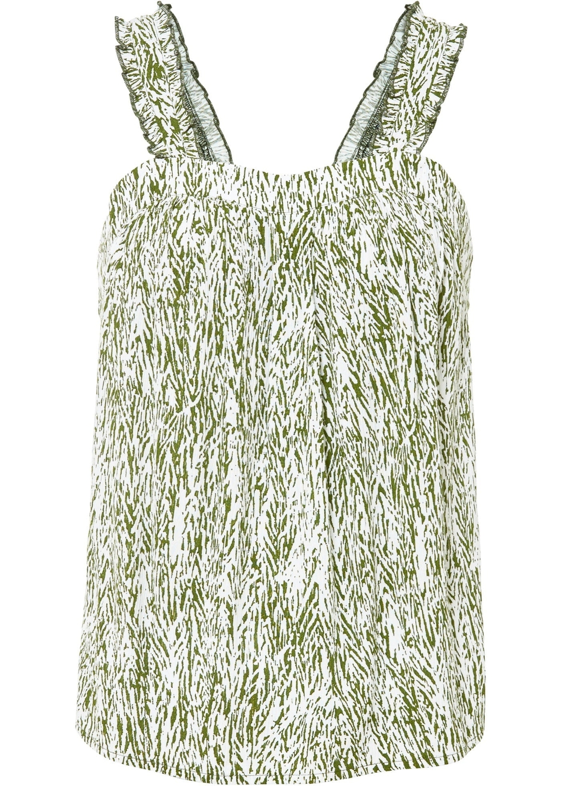 Blusentop aus Crepe. Farbe: Forstgrün Weiß Bedruckt. Material: Obermaterial: 100% Viskose (verifiziert). Nachhaltigkeit: Viskose aus zertifizierter Holzwirtschaft. Träger: Tanktop. Mode muss nicht teuer sein!