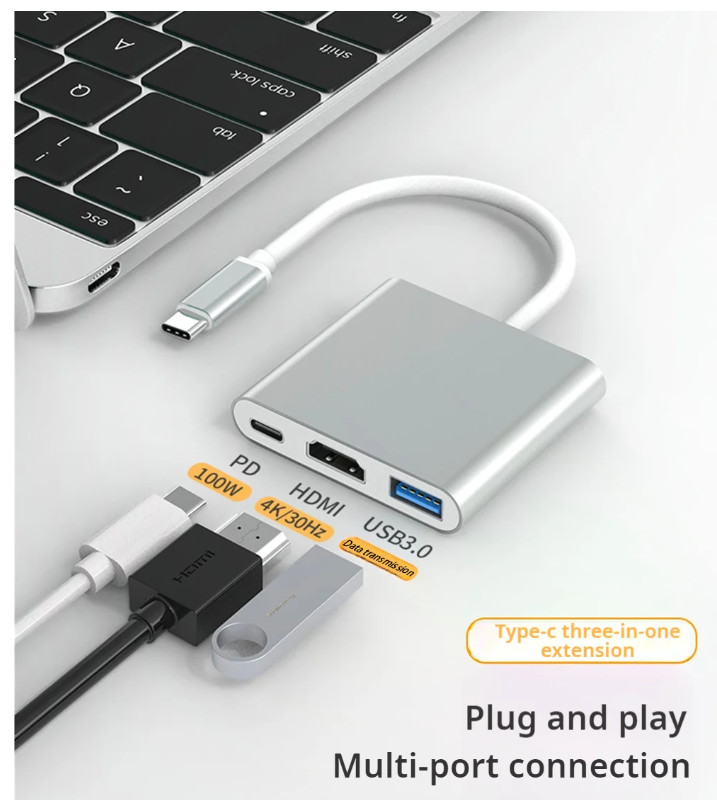 Anschluss B: TYP-C. Anschluss B: USB. Anschluss B: HDMI-kompatibel. Anschluss A: TYP-C. Typ: Typ-C-Kabel. 3 in 1 USB Hub USB C zu HDMI-kompatibler Splitter Hub Typ C zu HDMI-kompatibler USB 3,0 Docking station für MacBook Air Converter 4K.
