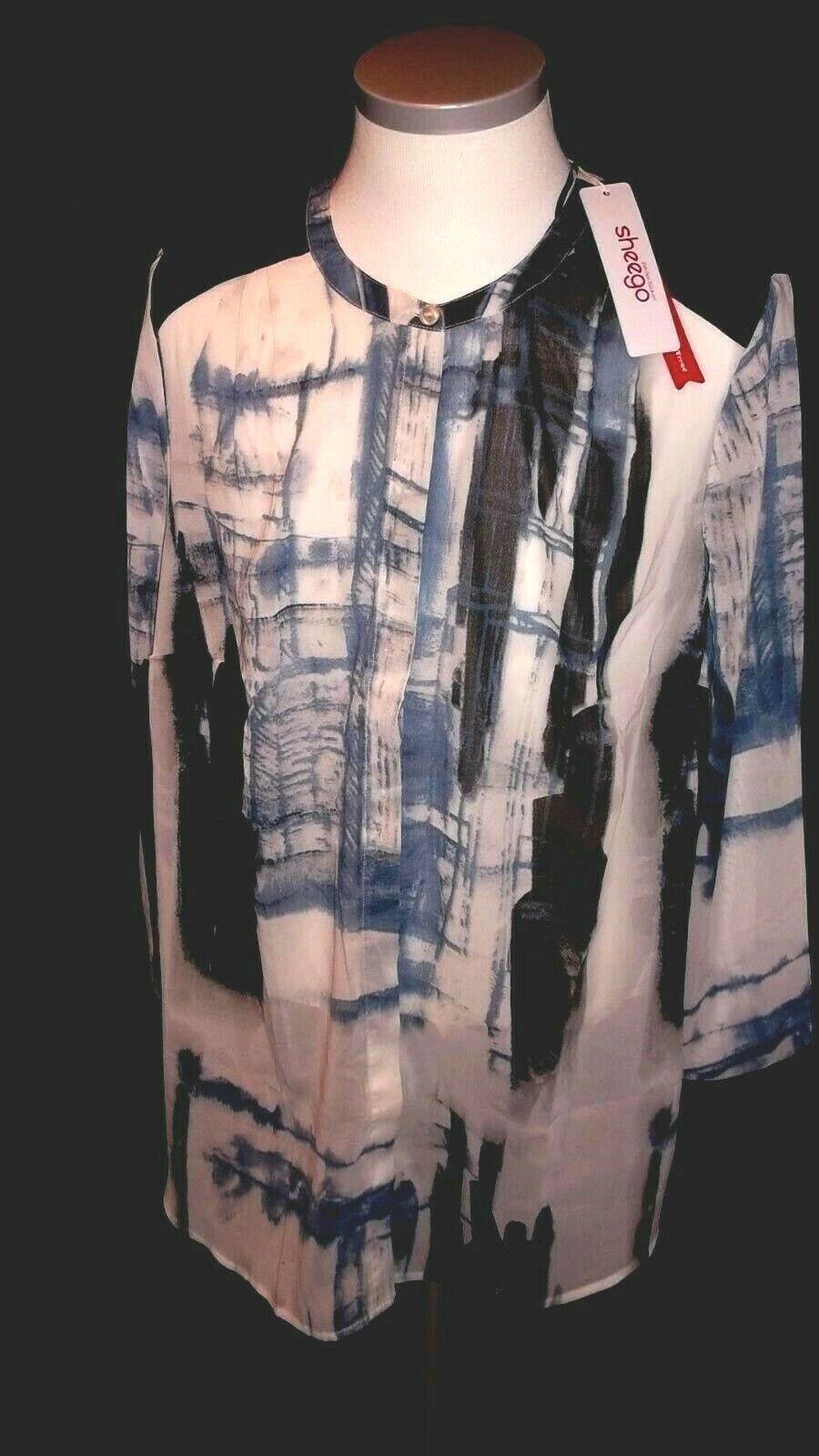 Longbluse mit durchgehender Knopfleiste. Marke: Sheego. Der hintere Teil etwas länger ,als vorn. FARBEN : blau-weiß-schwarz. Im vorderen Bereich mit Druck ,im hinteren Bereich schwarz. Zustand : NEU.