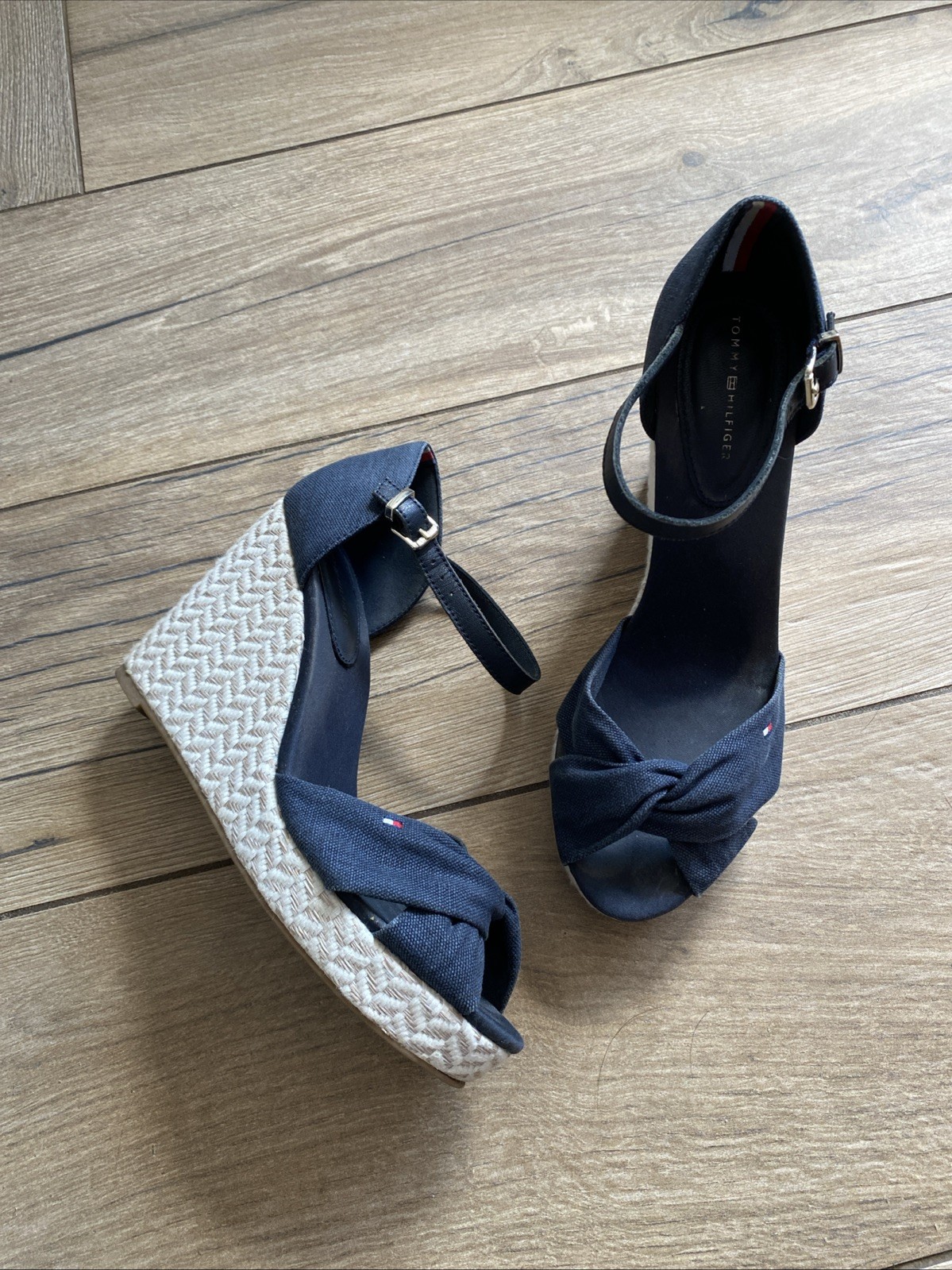 Zum Verkauf steht dieses wunderschöne Paar Keilsandalen Wedges Espandrilles in Gr. 41 von Tommy Hilfiger in Blau. Die Schuhe sind in einem einwandfreien Zustand und kaum getragen worden. Das Modell ist LENA. Weitere Details sind auf den Fotos zu sehen. Dies ist ein Privatverkauf, keine Rücknahme oder Garantie. Beim Kauf mehrerer Teile kann ich den Versand gerne kostengünstig zusammen fassen.