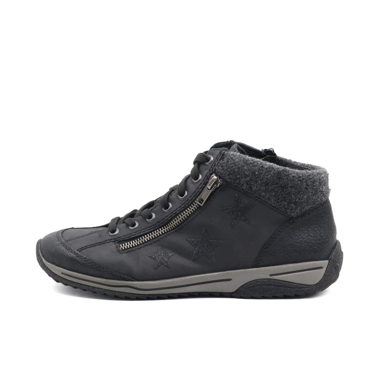Das edle High-Top-Design aus hochwertigem Synthetik-Obermaterial präsentiert sich mit dekorativen Stern-Akzenten und einem angenehm weichen Warmfutter. Die praktische Kombination aus Schnürung und seitlichem Reißverschluss ermöglicht ein schnelles An- und Ausziehen, während die rutschfeste Laufsohle festen Halt bietet.