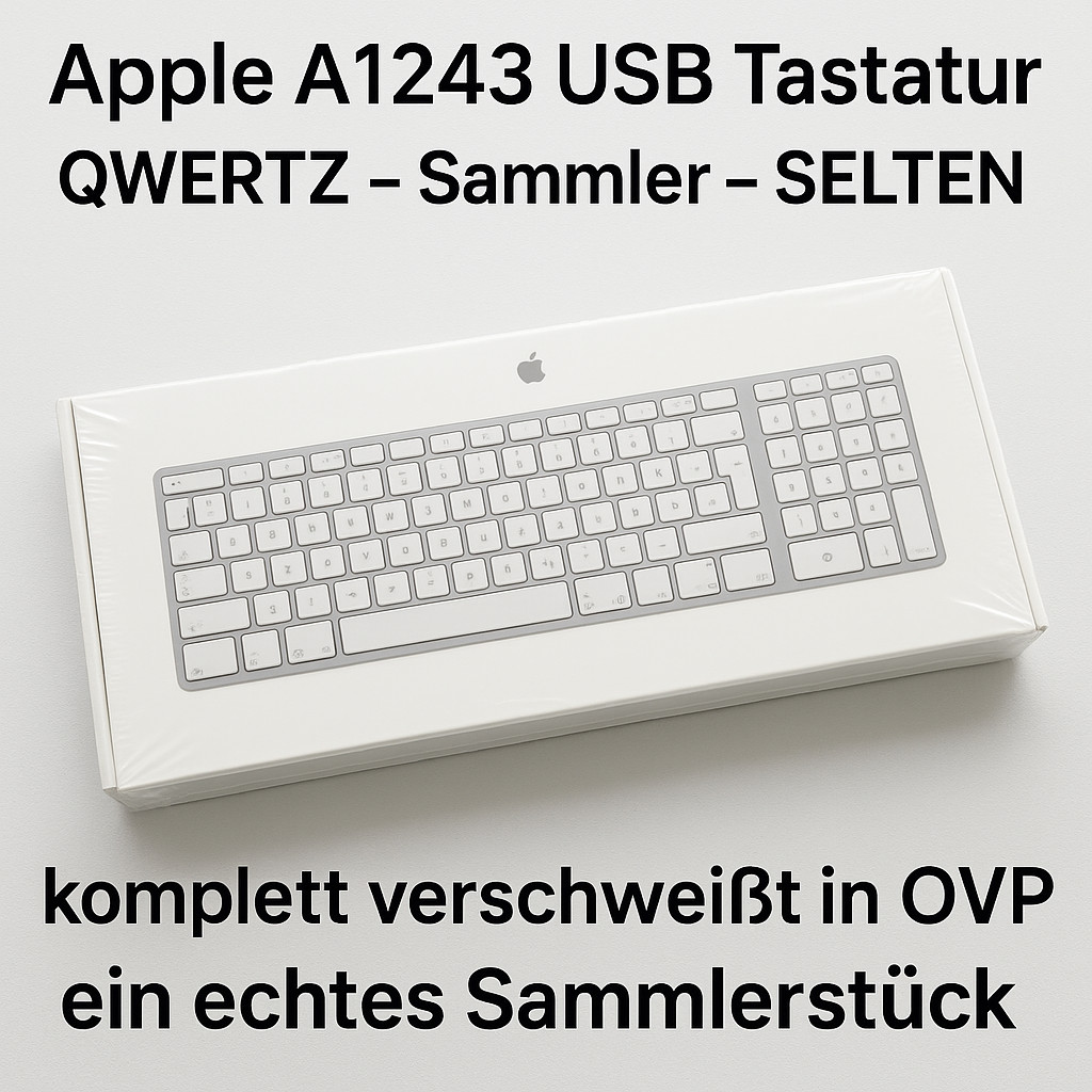 🔹Modell: Apple USB Keyboard A1243 – mit Ziffernblock. Die Tastatur ist ein Stück Apple-History – in diesem Zustand kaum noch zu finden. Perfekt für Sammler oder alle, die die hervorragende Haptik der klassischen Apple-Tastaturen lieben.
