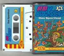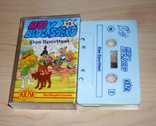 Bibi Blocksberg Das Sportfest. 1 Kassette mit leichten Gebrauchsspuren in Hülle. Hülle mit mittleren Gebrauchsspuren und Kratzern. Inlay/Cover mit mittleren Gebrauchsspuren, Flecken und Knicken/Faltspuren.