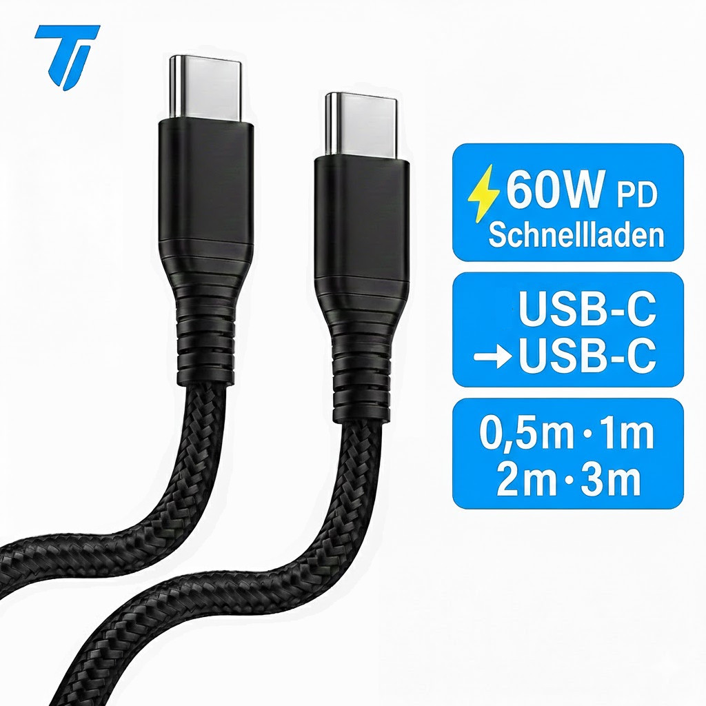 USB-C auf USB-C Ladekabel – 0,5 m / 1 m / 2 m / 3 m. Sichere Verbindung:verstärkte Knickschutzhülsen, fester Sitz. Passend für alle Geräte mit USB-C Anschluss, u. a. 💙Service & Sicherheit. 1× USB-C auf USB-C Kabel (Länge nach Wahl: 0,5 m / 1 m / 2 m / 3 m).