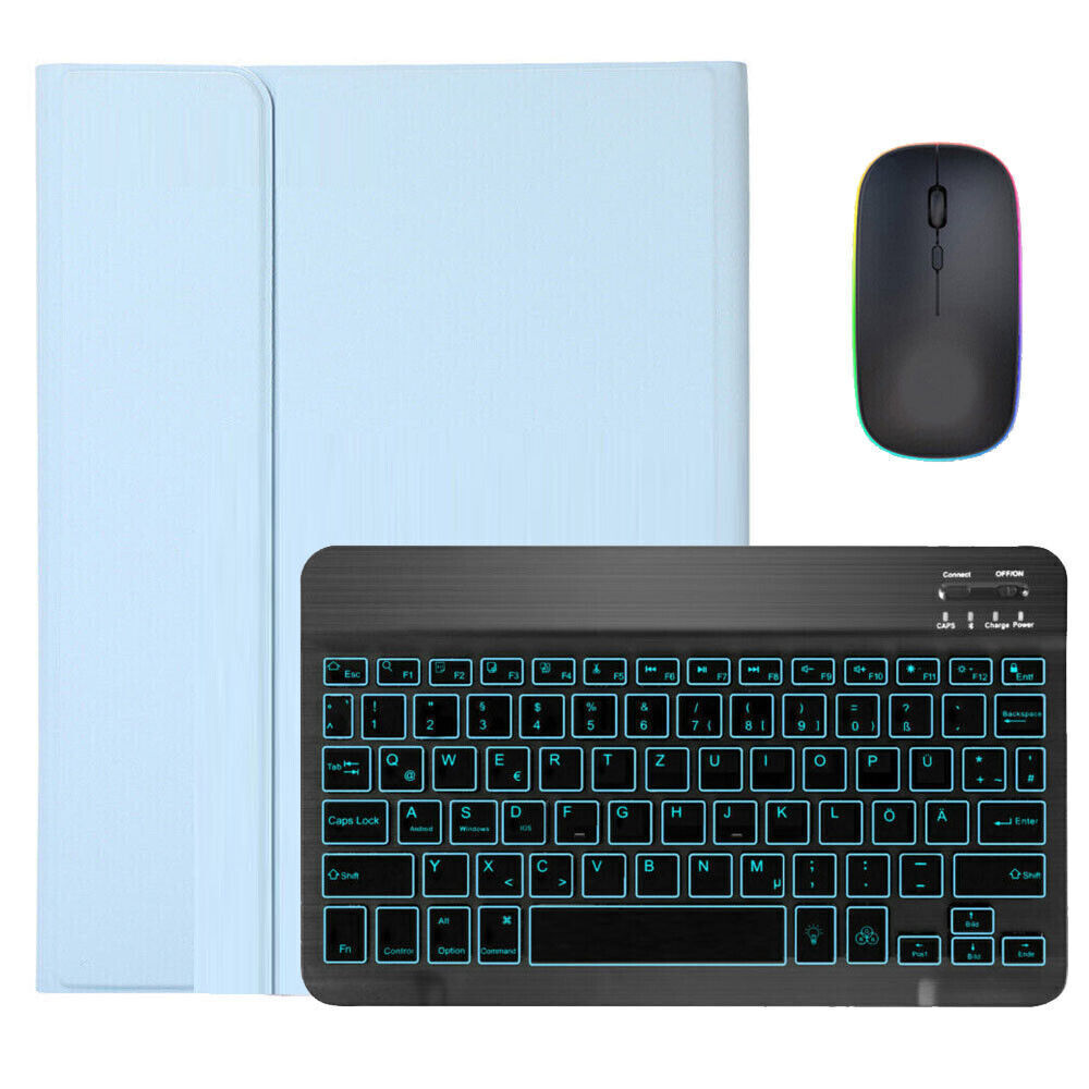 Bluetooth-Tastatur (QWERTZ) mit Beleuchtet. Abnehmbare Touchpad-Tastatur und Vollschutzabdeckung. Die Tastatur ist mit Bluetooth verbunden, die Maus ist mit Bluetooth verbunden (Ihr Gerät sollte die Bluetooth-Funktion unterstützen).