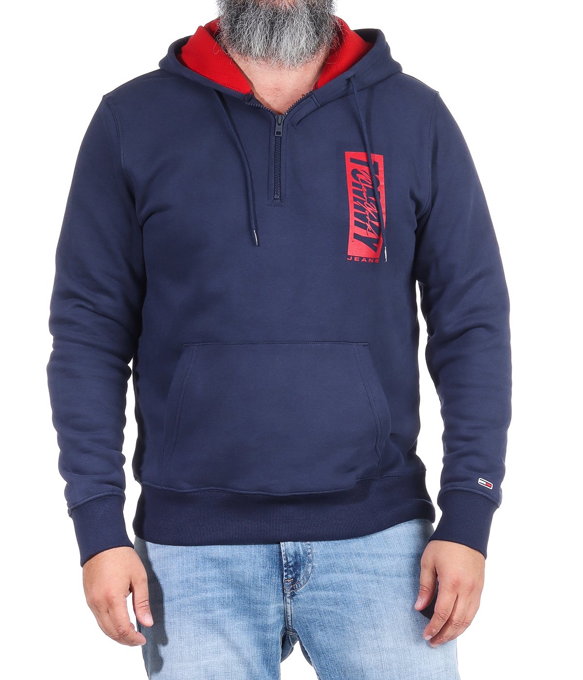 Tommy Jeans Sweatshirt DM0DM10213 Größe: frei wählbar siehe oben Farbe: frei wählbar siehe oben Nagelneuer Tommy Jeans Sweatshirt mit Kapuze. Schöne Qualität Schöner Druck auf Rücken und Brust. Logo am Ärmel. Kapuze und kurzen Reißverschluss und Kängurutasche Rippbündchen an Ärmel und Saum. Genialer Look einfach ein Hingucker! Material: 85% Baumwolle 15% Polyester.
