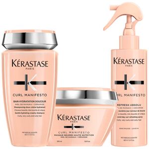 Kérastase Curl Manifesto Bain Hydration Douceur 250 mlKérastase Curl Manifesto Masque Beurre Haute Nutrition 200 mlKérastase Curl Manifesto Refresh Absolu 190 mlCurl Manifesto Bain Hydration Douceur: Feuchtigkeitsspendendes sanftes Creme-Haarbad für welliges bis leicht lockiges, lockiges und stark lockiges bis krauses Haar. Reinigt sanft Kopfhaut und Haar ohne die natürliche Lipidschicht zu entfernen und spendet den Locken intensive Feuchtigkeit.sanfte Reinigung von Kopfhaut und Haar.löst überschüssigen Sebum/Talg und Ablagerungen, ohne den natürlichen Lipidhaushalt zu verändernspendet intensive Feuchtigkeit ohne das Haar zu beschwerenverleiht den Locken GlanzAnwendung: Auf das feuchte Haar auftragen, emulgieren und einmassieren. Gründlich ausspülen.Curl Manifesto Masque Beurre Haute Nutrition: Besonders reichhaltige pflegende Maske für sehr lockiges und krauses Haar. Verleiht intensive Feuchtigkeit, unterstützt die natürliche Elastizität des Haares und schützt vor Haarbruch.pflegt trockenes, geschädigtes lockiges Haar und verleiht intensive Feuchtigkeitreduziert Haarbruch beim Kämmenverleiht seidigen GlanzAnwendung: Auf die handtuchtrockenen Längen und Spitzen auftragen. Einmassieren. 5 Minuten einwirken lassen. Gründlich ausspülen.Curl Manifesto Refresh Absolu: Lockenauffrischungsspray für lockiges, sehr lockiges bis krauses Haar. Der schwerelose Nebel verleiht dem Haar sofortige Feuchtigkeit und reaktiveiert die Lockendfinition, den Glanz und dei Sprungkraft zwischen den Haarwäschen.leichte Konsistenz für eine Anwendung ohne Rückstände und ohne zu beschwerenspendet intensive Feuchtigkeit, verleiht Geschmeidigkeit und Glanzunterstützt die natürliche Form der LockenFrizz-reduzierender Effekt auch bei hoher LuftfeuchtigkeitAnwendung: Schütteln und danach auf das Haar sprühen. Produkt mit den Fingern einarbeiten. An der Luft trocknen lassen oder bei niedriger Hitze föhnen. Curl ManifestoSetzen Sie lockiges oder krauses Haar mit der Auswahl professioneller Haarprodukte, die das Haar geschmeidig pflegen und mit Feuchtigkeit versorgen, in Szene.