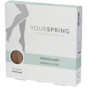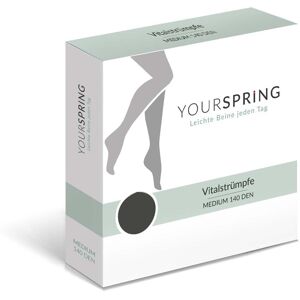 YOURSPRING medium transparent 140den AD 42/43 schwarz Der YOURSPRING Vitalstrumpf MEDIUM entlastet die Beine spürbar, gibt komfortablen Halt und bewahrt Ihnen Ihre Energie den ganzen Tag. YOURSPRING - Vitalstrümpfe richten sich aufgrund des feinen bis leicht gerippten Gestricks an Frauen. Egal, ob Sie lange im Büro sitzen, im Job viel stehen oder mit Auto, Bahn oder Flugzeug verreisen - YOURSPRING Vitalstrümpfe schenken im Alltag Entlastung und unsichtbaren Halt für die Beine. Wählen Sie aus drei Vitalisierungsarten: LIGHT (70 Den) - leichte Unterstützung; MEDIUM (140 Den) - spürbare Unterstützung; STRONG (280 Den) - deutlich spürbare Unterstützung Wählen Sie aus zwei Optiken aus: Transparent oder Blickdicht