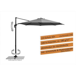 Schneider Sonnenschirm Rhodos Twist Bianco anthrazit 300 x 300 cm Produktnummer: 0691251868 Unser Rhodos Twist Bianco ist ein echter "Eyecatcher" für einen modernen Garten und eine moderne Terrasse. Durch seine Flexibilität schützt er Sie unabhängig des Sonnenstands perfekt vor der Sonnenstrahlung. Der Ampelschirm ist in drei Dimensionen verstellbar und kann bei Nichtgebrauch durch die mitgelieferte Schutzhülle abgedeckt werden. Das stylische weiße Gestell und die passenden Farben der Bespannung lassen Ihre Nachbarn vor Neid erblassen. Mit unserem Ampelschirm Rhodos Twist Bianco holen Sie Ihr Wohnzimmer nach draußen an die frische Luft und müssen sich keine Sorgen vor den schädlichen UV-Strahlen machen, da Sie zu jeder Tageszeit optimal geschützt sind. UV-Schutz 50 + Aufspannung durch Griffteil Schirmhöhe: 265 cm Material Sonnenschirmbespannung: 100 % Polyester Schirmmast: Aluminium, Stahl pulverbeschichtet weiß Maße Schirmmast: 53 x 80 mm Maße aufgespannter Schirm: 300 x 300 cm (B x T) Schirmform: quadtratisch Farbe: anthrazit verrottungsfest, wasserabstoßend imprägniert, mit air-vent, abnehmbar für Handwäsche, Drehteller mit Fußpedal zur Drehung des Schirms Gewicht: 25,7 kg Empfohlenes Mindestgewicht Schirmständer: 100 kg (je Platte 25 kg) Lieferumfang: Schirm ink. Plattenständer (Platten separat erhältlich), ink. Lichtdurchlässiger Schutzhülle mit Reißverschluss und Stab Herstellerinformationen: Xaver Schneider GmbH & Co. KG Obereschring 1 88512 Mengen, Deutschland eMail: info@schneider-schirme.com Herstellernr. 731-15