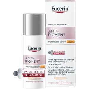 Anwendungsgebiet von Eucerin Anti-Pigment Tag Getönt Hell LSF 30Die Eucerin Anti-Pigment Tag Getönt Hell LSF 30 mit patentiertem Thiamidol® wirkt Pigmentflecken direkt am Ursprung entgegen und mindert diese zudem im Laufe der Zeit. Die Tagespflege kann dank des enthaltenen LSF 30 zusätzlich sicher vor der Entstehung neuer sonnenbedingter Pigmentflecken schützen. Die Formel der Eucerin Tagescreme mit LSF ohne Octocrylene mit mineralischen Farbpigmenten ist äußerst schnell einziehend. Außerdem deckt die Antipigmentcreme Pigmentflecken sofort ab und verleiht dem Gesicht so ein natürliches, gleichmäßiges Hautbild. In einer Studie bestätigten 96 % der Teilnehmenden, dass die Eucerin Creme für eine strahlendere Haut sorgt*. Bereits nach 2 Wochen sind erste Resultate der Anti Pigment Creme sichtbar. Darüber hinaus sind die sehr gute Hautverträglichkeit sowie die Pflegewirksamkeit der Creme gegen Pigmentflecken klinisch sowie dermatologisch erwiesen. *Neben anderen klinischen und dermatologischen Studien wurde eine Product in Use (PiU)-Studie mit 80 Frauen im Alter zwischen 25 und 55 Jahren durchgeführt. Sie berichteten über die folgenden Ergebnisse, nachdem sie das Produkt vier Wochen lang regelmäßig verwendet hatten. Beiersdorf AG, PiU, Italien, März-April 2021 Wirkstoffe / Inhaltsstoffe / ZutatenEucerin Anti-Pigment Tag Getönt Hell LSF 30 enthaltene Wirkstoffe: 1. Thiamidol® ® 2. Licochalcone A 3. LSF 30 Aqua, Alcohol Denat, CI 77891, Dibutyl Adipate, Butyl Methoxydibenzoylmethane, Butylene Glycol Dicaprylate/Dicaprate, C12-15 Alkyl Benzoate, Bis-Ethylhexyloxyphenol Methoxyphenyl Triazine, Ethylhexyl Salicylate, Ethylhexyl Triazone, Glycerin, Cetearyl Alcohol, Silica, Silica Dimethyl Silylate, Cocoglycerides, Copernicia Cerifera Cera, Diethylamino Hydroxybenzoyl Hexyl Benzoate, Phenylbenzimidazole Sulfonic Acid, Isobutylamido Thiazolyl Resorcinol ( Thiamidol®), Glycyrrhiza Inflata Root Extract, Tocopherol, Tap