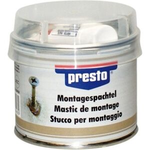 PRESTO Montagespachtel DIY (250 g) Presto Montagespachtel ist ein zweikomponentiger Polyesterspachtel. Er eignet sich für viele Anwendungsbereiche wie Kleben, Verbinden, Dichten oder zum Schließen von Löchern und Beschädigungen. Universell einsetzbar im gesamten Hobby- und Do-it-Yourself-Bereich. Eigenschaften: Farbe: grau Inhalt: 250gGewicht [kg]:0,304 kg Arbeitstemperatur von [°C]:12 °C Tiefe [mm]:78 mm Gewicht [g]:250 g Gebindeart:Dose Arbeitstemperatur bis [°C]:30 °C Höhe [mm]:80 mm Breite [mm]:78 mm