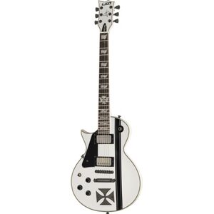 ESP Iron Cross SW, Single cut Linkshänder E-Gitarre; James Hetfield Signature Modell; Korpus: Mahagoni; Decke: Ahorn; Hals: Mahagoni; Griffbrett: Makassar Ebenholz; Halsbefestigung: geleimt; Halsprofil: Thin U; 22 Extra Jumbo Bünde; Sattelbreite: 42 mm (1,65"); Mensur: 629 mm (24,75") - 350 mm-13,78"); Schlagbrett: Schwarz; Tonabnehmer: Active EMG JH SET (Steg) - Active EMG JH SET (Hals); Regler: 2x Volume, 1x Tone; Schalter: 3-Wege Toggle; Steg: Tonepros Locking TOM & Tailpiece; Hardware Oberfläche: Schwarz; Mechaniken: LTD Locking; inkl. Koffer; Farbe: Snow white with black stripes; Originalbesaitung: D'Addario XL110 (.010-.046)