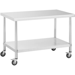Edelstahlmöbel sind die Grundlage für eine hygienische Küche und die saubere Herstellung von Lebensmitteln aller Art. Der Edelstahltisch mit Rollen aus dem Gastronomiebedarf von Royal Catering passt in jede professionell eingerichtete Küche. Er wurde speziell für die hohen Anforderungen in der Gastronomie entworfen und bietet durch sein zweistufiges Design eine zusätzliche Ablagefläche. 4 Rollen – davon 2 mit Bremse – sorgen für Mobilität und den flexiblen Einsatz des Tisches. Die Arbeitsfläche des Edelstahltisches misst 60 x 100 cm und bietet auf einer Höhe von 85 cm jede Menge Platz für Ihre tägliche Arbeit. Eine zweite 88 x 48 cm messende Ebene dient als zusätzliche Ablagefläche. Sie trägt bis zu 60 kg und ermöglicht ein gut strukturiertes, übersichtliches Arbeiten. Auch größere Gegenstände lagern Sie dank der großzügigen Höhe von 53 cm auf der zweiten Ebene. Dank des einfachen und schnellen Aufbaus durch das mitgelieferte Montagmaterial ist der Arbeitstisch auf Rollen schnell einsatzbereit. Die massiven, runden Tischbeine mit einem Durchmesser von 48 mm stabilisieren und erhöhen die maximale Tragfähigkeit. Diese liegt für den Arbeitstisch fahrbar bei 155 kg. Die hochwertige und präzise Verarbeitung sorgt für weitere Stabilität und Sicherheit. Der Arbeitstisch Rollen besteht aus poliertem Edelstahl und besticht durch hohe Widerstandsfähigkeit, eine lange Lebensdauer und ist beständig gegen Korrosion sowie mechanische Beschädigungen (z. B. Kratzer). Das Material lässt sich leicht und gründlich reinigen, und bietet somit perfekte Voraussetzungen für ein hygienisches Arbeiten mit Lebensmitteln.
