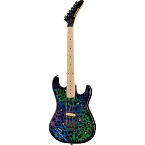 Kramer Guitars Feral Cat Baretta Rainbow Leo; Baretta E-Gitarre; Original Serie; Korpus: Erle; Hals: Ahorn; Griffbrett: Ahorn; Halsbefestigung: geschraubt; Halsform: Kramer Thin Profile; Einlagen: Black Dots; 22 Jumbo Bünde; Sattel: Floyd Rose R2 1000 Serie Locking; Sattelbreite: 41,3 mm (1,63"); Mensur: 648 mm (25,51"); Griffbrettradius: 320 mm (12,6"); Tonabnehmer: Seymour Duncan JB Zebra (Steg); Regler: Master Volume mit Push/Pull für Seriell/Parallel; Tremolo: Floyd Rose 1000 Serie Tremolo; Hardware Oberfläche: Schwarz; Mechaniken: Mini Die-Cast; Kramer Premium Gigbag; Farbe: Feral Cat Rainbow Leo; Originalbesaitung: .009 - .042
