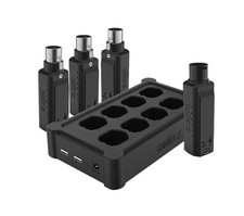 Chauvet DJ D-Fi XLR-Paket; Set für drahtlose DMX Kommunikation enthält 1 Sender, 3 Empfänger und 1 Multi-Ladegerät; Multi-Ladegerät lädt gleichzeitig bis zu 8 D-Fi XLRs (zusätzliche Einheiten separat erhältlich); Kontaktstifte laden alle D-Fi-XLRs ohne Kabel auf; Enthält 2 zusätzliche USB-Anschlüsse zum Aufladen zusätzlicher Geräte; Technische Daten: Eingangsspannung: 5 VDC, 500 mA (externe Stromversorgung: 100 bis 240 VAC, 50/60 Hz); Leistung und Strom: 19 W, 0,3 A bei 120 V, 60 Hz; Zulassungen: CE, FCC, RTTE; Ladegerät-Gewicht: 0,2 kg; Größe des Ladegeräts: 270 x 186 x 112 mm;