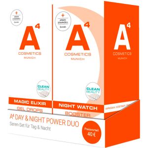 Das A4 Cosmetics Day & Night Seren Set enthält: 1 x A4 Magic Elixier, 20 ml1 x A4 Night Watch Booster, 20 ml A4 Magic Elixier: A4 Magic Elixir ist ein hochwirksames Anti-Aging-Gesichtsgel der Argan-Forschung 2.0 für die tiefgreifende Verjüngung Ihrer Haut. Es ist keine Zauberei, fühlt sich aber so an. Das Elixir enthält zu 100 % pflanzlichen Arganstammzellextrakt, der dazu beiträgt, den Zellstoffwechsel im Bindegewebe zu aktivieren, die Hautzellen zu schützen und somit die Hautalterung zu verzögern. Die Haut sieht länger jugendlich frisch und straff aus, die Reduktion von Falten und eine erhöhte Hautdichte werden unterstützt. Anwendung: Das A4 Magic Elixir Gesichtsgel sollten Sie 1 bis 2 Mal täglich nach der Reinigung auf Gesicht, Hals und Dekolleté auftragen. Anschließend können Sie die gewohnten Pflege-Produkte auftragen. Das A4 Magic Elixir ist ideal für eine 30-Tage-Intensivkur geeignet. Dieses Gesichtsgel ist für jeden Hauttyp die richtige Hilfe. Hauptinhaltsstoffe: Geben Sie der Natur die Gelegenheit, ihre ganze Magie zu entfalten. Dazu beinhaltet das wertvolle Gesichtsgel Magic Elixir folgende Wirkstoffe: Die hochkonzentrierte Pflege mit naturbelassenem ROSENWASSER enthält den ersten kosmetischen Pflanzenwirkstoff, der hilft die Vitalität der dermalen Hautzellen zu aktivieren und deren zelluläre Eigenschaften zu bewahren.Verstärkt wird die Wirkung durch spezielle hochdosierte Botenpeptide, die in der Lage sind, die Aktivierung hauteigener Reparaturprozesse zu unterstützen.PFLANZLICHE OLIGOSACCHARIDE helfen das Hautrelief zu verbessern, Falten zu glätten und somit der Haut neue Spannkraft und Elastizität zu verleihen.Ein HAUTIDENTISCHES LIPID-KONZENTRAT versorgt die Haut mit mehr Feuchtigkeit und erhöht den Schutz der Haut.Ein Wirkstoffkomplex aus lang- und kurzkettiger Hyaluronsäure fördert die Durchfeuchtung der Haut und hilft dabei Irritationen durch Umwelteinflüsse zu reduzieren.Panthenol (Provitamin B5) wirkt entzündungshemmend und regenerierend. A4 Night Watch Booster: A4 NIGHT WATCH BOOSTER ist ein hochwirksames und schnelles Aktivsystem für die Nacht: Der neue, intelligente Anti-Aging Booster arbeitet mit einem innovativen Probiotic Technology Complex und 100 % pflanzlichem Arganstammzellextrakt daran, die glättenden Wirkstoffe genau dorthin zu transportieren, wo die Haut sie braucht - in die Zellen. Das Außergewöhnliche an dieser Wirkstoffkombination: Natürliche Reparaturmechanismen werden angeregt und die Schutzfunktion der Haut wird gestärkt. Anwendung: Zur intensiven Pflege abends nach der Reinigung auf Gesicht, Hals und Dekollete auftragen und sanft einmassieren. Für ein optimales Ergebnis anschließend die A4 NIGHT WATCH CREME auftragen. Hauptinhaltsstoffe: Die wichtigsten Inhaltsstoffe der perfekt abgestimmten Anti-Aging-Formula sind pflanzlicher Herkunft für ein sensationell schnell wirkendes Serum: Der Probiotic Technology Complex unterstützt die Produktion essentieller Proteine und Enzyme, mit denen sich ihre Haut erneuert,...