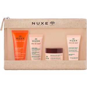 Tauchen Sie ein in die wohltuende Welt des Honigs mit dem verwöhnenden Ritual der nährenden Pflegeprodukte des Rêve de Miel Sets von Nuxe. Dieses Set enthält: 1 x Rückfettendes Reinigungsgel Gesicht und Körper Rêve de Miel, 30 ml 1 x Ultra-Komfort Gesichtsbalsam Rêve de Miel, 15 ml 1 x Zart schmelzender Ölbalsam für den Körper mit Honig Rêve de Miel, 30 ml 1 x Hand- und Nagelcreme Rêve de Miel, 15 ml Anwendung: Rückfettendes Reinigungsgel Gesicht und Körper Rêve de Miel: Eine haselnussgroße Menge des Gels auf die feuchte Haut auf das Gesicht und den Körper auftragen, den cremigen Schaum genießen und anschließend abwaschen. Augenkontakt vermeiden. Ultra-Komfort-Gesichtsbalsam Rêve de Miel: Morgens und/oder abends eine haselnussgroße Menge auf das gereinigte Gesicht und den Hals auftragen Eignet sich das ganze Jahr über für trockene und empfindliche Haut oder bei starker Kälte für normale Hauttypen. Zart schmelzender Ölbalsam für den Körper mit Honig Rêve de Miel: Täglich auf dem ganzen Körper auftragen und sanft einmassieren, bis sich die Textur in ein Öl verwandelt. Hand- und Nagelcreme Rêve de Miel: Die Hand- und Nagelcreme auftragen, dabei insbesondere auf die Fingernägel achten.
