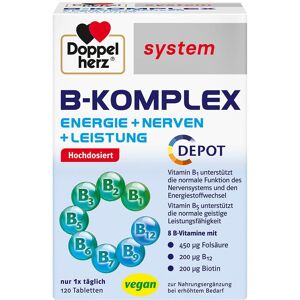 Anwendungsgebiet von Doppelherz B-Komplex system TablettenDoppelherz B-Komplex system Tabletten sind ein Nahrungsergänzungsmittel mit mit B-Vitaminen.Die Vitamine B6 und B12 für den Stoffwechsel, Vitamin B6 leistet einen Beitrag für die normale Cystein-Synthese, den normalen Energiestoffwechsel und den normalen Eiweiß- und Glycosestoffwechsel. Vitamin B12 leistet einen Beitrag für den normalen Homocystein-Stoffwechsel, den normalen Energiestoffwechsel und die Funktion bei der Zellteilung. Biotin (Vitamin B7), Niacin (Vitamin B3), Vitamin B1, B2, B6 und B12 tragen zum normalen Energiestoffwechsel bei und unterstützen die normale Funktion des Nervensystems. Pantothensäure (Vitamin B5) spielt für die normale geistige Leistungsfähigkeit eine Rolle. Vitamin B12 trägt zur Verringerung von Ermüdung und Müdigkeit bei. Folsäure (Vitamin B9) leistet einen Beitrag für die normale Blutbildung und hat eine Funktion bei der Zellteilung. Die Vitamine B6, B12 und Folsäure tragen zu einem normalen Homocysteinstoffwechsel bei. Vitamin B1 leistet einen Beitrag für die normale Herzfunktion. Wirkstoffe / Inhaltsstoffe / ZutatenZusammensetzung von Doppelherz B-Komplex system Tabletten: Zutaten: Füllstoff Dicalciumphoshat, Füllstoff mikrokristalline Cellulose, Überzugsmittel Hydroxypropylmethylcellulose, Nicotinamid, Calcium-D-pantothenat, modifizierte Stärke, Riboflavin, Thiaminmononitrat, Pyridoxinhydrochlorid, Trennmittel Speisefettsäuren, Trennmittel Talkum, Trennmittel Magnesiumsalze der Speisefettsäuren, Farbstoff Eisenoxide und Eisenhydroxide, Feuchthaltemittel Glycerin, Pteroylmonoglutaminsäure, D-Biotin, Cyanocobalamin Zusammensetzung pro Tagesportion (= 1 Kapsel) % NRV* Vitamin B1 15 mg 1364 % Vitamin B2 20 mg 1429 % Niacin 30 mg 188 % Pantothensäure 25 mg 417 % Vitamin B6 10 mg 714 % Folsäure 450 μg 225 % Biotin 200 μg 400 % Vit