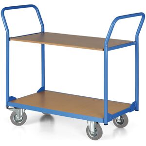 Aufbau Die multifunktionalen Transportwagen ermöglichen die Zusammenstellung von Varianten nach Kundenwunsch durch einfaches Einsetzen des gewünschten Aufbaus und dessen Befestigung mit einer Schraube. Die spezielle Aufnahme der Griffe sorgt dafür, dass der Griff immer fest mit der Plattform des Wagens verbunden ist und verhindert so, dass sich der Griff während der gesamten Lebensdauer des Wagens in seiner Aufnahme lockert (wackelt). Die Ladefläche ist aus Stahlprofilen geschweißt, die Bauweise garantiert die beste Stabilität auch bei hohen Belastungen. Die Metallteile sind mit Pulverlack RAL 5005 lackiert. Die Ladefläche und die Holzwände bestehen aus einer beschichteten Spanplatte mit einem hellen Buchendekor. Die seitlichen und vorderen Holzplatten sind mit einer 1 mm breiten blauen ABS-Kante umleimt. Rollen Die Rollen sind mit einer Abdeckung versehen, die verhindert, dass sich Fäden und Schnüre aufwickeln und das Lager mit verschiedenen Verunreinigungen verstopfen, wodurch die Lebensdauer der Rolle verlängert wird. Die Rollen sind mit Wälzlagern aus Stahl ausgestattet, die Vollgummirollen 98 Shore A garantieren einen ruhigen Lauf und ein einfaches Manövrieren. Das graue Gummi der Rollen hinterlässt keine Spuren auf dem Boden. Je nach Größe der Ladefläche sind die Wagen mit Rollen von 125, 160 oder 200 mm Durchmesser ausgestattet. 2 Bockrollen und 2 Lenkrollen mit Feststeller zur Sicherung gegen unbeabsichtigtes Wegrollen des Wagens. Die robuste und kompakte Bauart der Ladefläche sowie die eingesetzten hochwertigen Rollen machen diese Wagen selbst unter den härtesten Betriebsbedingungen extrem zuverlässig. Eigenschaften: Regalbodenmaße B x L (mm): 450 x 700, Anzahl Regalböden: 2, Radtyp: schwarze Gummilauffläche, Konstruktionsfarbe: blau, Tragfähigkeit (kg): 250, Raddurchmesser (mm): 125, Griffhöhe (mm): 1025, Regaltyp: laminierte Spanplatte