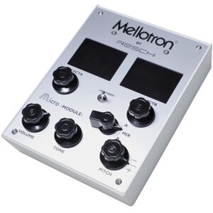 Mellotron Micro Module; Digitales Mellotron; im Desktop-Format ohne Klaviatur; Sample-Playback-Engine mit 24-Bit Audiodaten; 100 Mellotron- und Chamberlain-Sounds (basierend auf den Original Sounds der ersten Generation aus den 60er und 70er Jahren); Regler für High/Low, Volume, Tone, Pitch und A/B Mix; 2 Displays; Anschlüsse: 1x Line-Ausgang (6,3mm Klinke), 1x Sustain-Pedaleingang (6,3mm Klinke), 1x Stereo-Kopfhörerausgang (6,3mm Klinke), 1x MIDI In/Thru (3,5mm Klinke), 1x Netzteilanschluss; Lieferumfang: 1x Netzteil, 1x Netzkabel, 1x MIDI-Kabel 3,5mm/5-pin DIN (Typ B); Hinweis: kann nicht mit CF-Erweiterungskarten erweitert werden; Abmessungen (L x B x H): 184 x 135 x 65mm; Gewicht: 710g