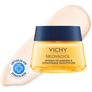 Anwendungsgebiet von VICHY NEOVADIOL, ex Magistral NachtVICHY NEOVADIOL, ex Magistral Nacht ist eine pflegende & straffende Nachtpflege für die Haut nach den Wechseljahren. Die Creme gleicht den Lipidverlust der Haut aus und fördert die Hautelastizität.Wirkungsweise von VICHY NEOVADIOL, ex Magistral NachtIn und nach den Wechseljahren beschleunigen hormonelle Schwankungen die Hautalterung. Die Haut wird trockener, dünner und verliert an Festigkeit. Der zunehmende Lipidverlust kann zu Spannungsgefühlen führen. Die NEOVADIOL Intensiv pflegende & straffende Nachtpflege (ehemals Magistral Nacht) regeneriert die Haut, fördert erholte Gesichtszüge und gleicht den täglichen Lipidverlust aus. Die Formel der reichhaltigen Anti-Aging Nachtcreme enthält Proxylane, Cassia-Extrakt und vitale Öle mit Omega-Fettsäuren 3, 6, 9. Diese wertvollen Wirkstoffe mildern die sichtbaren Anzeichen der Wechseljahre auf der Haut. Die Nachtcreme schenkt ein intensives Wohlgefühl und ist für empfindliche Haut geeignet.DosierungAnwendungsempfehlung von VICHY NEOVADIOL, ex Magistral Nacht: