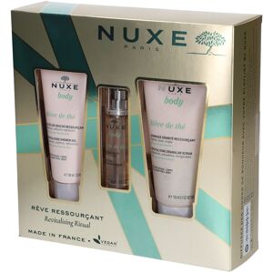 NUXE Geschenkset Rêve de Thé Dieses Set besteht aus: NUXE Rêve de Thé Belebendes Duschgel NUXE Rêve de Thé Vitalisierendes Duftspray NUXE Rêve de Thé Belebendes Granita-Peeling NUXE Rêve de Thé Belebendes Duschgel Die Hautpflege Rêve de Thé richtet sich an Frauen, die ihren Körper pflegen und sich gleichzeitig verwöhnen möchten, indem sie sich einen Wohlfühlmoment für Körper und Geist gönnen. Als Nachfolger der beliebten Nuxe Body Serie überzeugt Sie mit verbesserten Texturen und einem neuen frischen Duft. Das belebende Nuxe Body Reve de The Duschgel reinigt die Haut sanft dank einer pflanzlichen waschaktiven Substanz ohne Sulfate. Grüntee-Extrakt ist feuchtigkeitsspendend und sorgt für ein angenehmes Hautgefühl. Nach der Anwendung fühlt sich die Haut geschmeidig, und frisch an. Die frische und zarte Geltextur schäumt beim einmassieren wohltuend auf und lässt sich sehr leicht abspülen. Der Duft mit Noten von Rhabarber, frischen Kräutern und grünem Tee beleben den Geist und erfrischen die Sinne Wirksamkeit bestätigt Die Haut wird sanft gereinigt finden 95% der Anwenderinnen (1) Die Haut ist weich für 100% der Anwenderinnen (1) Das Produkt respektiert die Haut für 100% der Anwenderinnen (2) Die Haut ist frisch für 95% der Anwenderinnen (1) Anwendungstest - 20 Freiwillige. Prozentsatz der Zufriedenheit: (1) Unmittelbar nach der Anwendung. (2) Nach 21 Tagen. Reinigung Eine tägliche Reinigung der Haut ist entscheidend, um alle Unreinheiten zu beseitigen und zu verhindern, dass sie sich festsetzen und die Poren verstopfen. Zwar ist die Reinigung der Haut sehr wichtig, aber sie sollte immer sanft und schonend erfolgen, ohne sie abzuschälen. Nur so bleibt der Hydrolipidfilm erhalten, der unsere Haut von Natur aus umhüllt und vor äußeren Reizen schützt. Stimmen Sie Ihre Körperpflege unbedingt auf Ihren Hauttyp ab. Normale Haut benötigt in der Regel Feuchtigkeit und trockene Haut eine rückfettende Pflege mit Lipiden. Hier empfiehlt sich die reichhaltige Rêve de Miel Serie von Nuxe. Eigenschaften: milde Körperreinigung, zart pflegend und erfrischend sanfte Reinigung mit natürlichen Tensiden, welche die Bedürfnisse der Haut berücksichtigen feuchtigkeitsspendendes Grüntee-Extrakt sorgt für ein angenehmes Hautgefühl Die erfrischende, zart schmelzende Gelée-Textur, schäumt die Haut wunderbar ein Mit 95% natürlichen Inhaltstoffen Hauttyp: Normale Haut, trockene Haut; empfindliche Haut, feuchtigkeitsarme Haut, Körperreinigung, Körperpflege. NUXE Rêve de Thé Vitalisierendes Duftspray Das vitalisierende Duftspray mit belebender und regenerierender Wirkung regt mit seinen olfaktorischen Noten aus Rhabarber, grünem Tee und frischen Kräutern die Sinne an. Der spritzige Duft verschafft ein Gefühl von Frische und umhüllt die Haut mit einem Nebel voller Wohlbefinden. NUXE Rêve de Thé Belebendes Granita-Peeling Die Produktserie Rêve de Thé richtet sich an Frauen, die ihren Körper pflegen und sich gleichzeitig verwöhnen möchten, indem sie sich einen Wohlfühlmoment für...