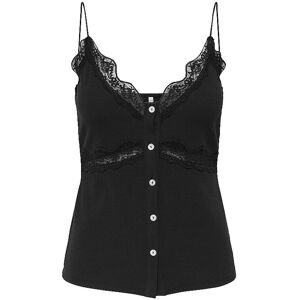 Verändere dein Alltagsoutfit in Sekundenschnelle, indem du mit einem femininen Oberteil einen weichen und schicken Akzent setzt. Damen Top aus Baumwoll-Stretch V-Ausschnitt mit Spitzenbesatz Spaghettiträger Knopfleiste in der vorderen Mitte Schmale Passform Unifarben Farbbezeichnung: Black Material: 95% Baumwolle, 5% Elasthan