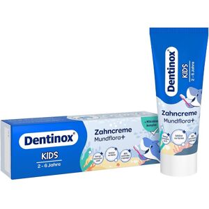 Anwendungsgebiet von Dentinox® Zahncreme Mundflora+ Kids Dentinox® Zahncreme Mundflora+ Kids: Zuverlässiger Kariesschutz und natürliche Pflege für empfindliche Milchzähne – mit Mikrobiom-Komplex für eine gesunde Mundflora und starke Zähne.Dentinox® Zahncreme Mundflora+ Kids wurde speziell für Kinder im Alter von 2 bis 6 Jahren entwickelt – eine entscheidende Phase, in der die Milchzähne besonders geschützt werden müssen, um eine gesunde Entwicklung der Mundflora und der nachfolgenden bleibenden Zähne zu unterstützen.Die Zahnpasta bietet einen altersgerechten Kariesschutz mit Fluorid (1.000 ppm) zur Remineralisierung des Zahnschmelzes und mit Xylitol, das das Wachstum kariesverursachender Bakterien hemmt. Die sanfte Reinigung erfolgt mit pflanzenbasierten Putzkörpern aus Cellulose, die Plaque gründlich und schonend entfernen – ohne den empfindlichen Milchzahnschmelz anzugreifen.Die Zahnpasta enthält den Mikrobiom-Komplex des Ferments aus dem Probiotikum Lactobacillus plantarum (INCI: Lactobacillus Ferment) und dem Harz der Akazie (INCI: Acacia Senegal Gum) unterstützt das Gleichgewicht der Mundflora und stärkt die natürliche Schutzbarriere der Mundschleimhaut. Panthenol beruhigt das Zahnfleisch, während Hyaluron Feuchtigkeit spendet und die Regeneration unterstützt.Mit 98 % Inhaltsstoffen natürlichen Ursprungs*, vegan**, homöopathieverträglich und frei von unerwünschten Zusatzstoffen ist Dentinox® Zahncreme Mundflora+ Kids ideal für die tägliche Pflege der Milchzähne geeignet – sanft und sicher.Kariesschutz für Milchzähne mit Fluorid & Mikrobiom-KomplexReinigt besonders sanft und schonend durch ausgewählte hochwertige InhaltsstoffeRemineralisiert die Zähne durch einen altersgerechten Fluoridgehalt (1.000 ppm)Entfernt besonders sanft Plaque durch CellulosePflegt und stärkt die Mundflora durch den Mikrobiom-KomplexUnterstützt die Mundschleimhaut bei Entzündungen mit Panthenol & HyaluronMit fruchtigem Geschmack98