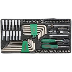 Anzahl Einsätze/Schubladen: 1+1+1 [3] / 1; G+F; type F. Anzahl der Werkzeuge: 62. Buchsengröße [Zoll]: 1/4. Einsatztyp: Kunststoff. Einsätze Größe [mm]: 190x380. HEX Größe [mm]: 10; 3; 4; 5; 6; 8. Hersteller: HANS. Herstellernummer: TT-43. Index: TT-43. Kappengröße [mm]: 4; 4,5; 5; 6; 7; 8; 9; 10; 11; 12; 13. Metergröße [mm]: 4; 5,5; 7. POZIDRIV Größe: PZ1; PZ2. Philips Größe : PH1; PH2. Profil: E-TORX, Flach, HEX, Philips PH, POZIDRIV PZ, TORX, TORX TAMPER. TORX Größe: T10, T15, T20, T25, T27, T30, T40, T8, T9. TORX TAMPER Größe: T25H, T30H, T40H, T45H, T50H, T55H. TORX/PENTACLE Größe: E10; E11; E4; E5; E6; E7; E8. Werkzeugtyp: Buchse/Sechskant; Buchse/Stift (Bit) flach; Buchse/Stift (Bit) Philips PH; Buchse/Stift (Bit) Pozidriv PZ; Buchse/Stift (HEX); Buchse/Stift (TORX); Erweiterung; Gelenk; HEX-Schlüssel; Kappe E-TORX; Knopf; Rassel; TORX TAMPER Schlüssel.