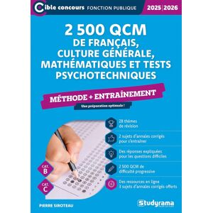 Binding : paperback, Label : 2 500 QCM de français, culture générale, mathématiques et tests psychotechniques – Méthode + entraînement (Catégories B et C – Édition 2025-2026), Format : big_book, medium : paperback, numberOfPages : 452, publicationDate : 2025-01-13, languages : french, ISBN : 2759056783