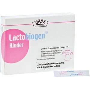 Nahrungsergänzungsmittel sind kein Ersatz für eine ausgewogene und abwechslungsreiche Ernährung und eine gesunde Lebensweise. Lactobiogen® Kinder Beutel Lactobiogen® Kinder ist ein Probiotikum zur Unterstützung der natürlichen Darmflora. Es enthält 2 ausgesuchte Milchsäurebakterienstämme in hoher Konzentration (6 x 109 vermehrungsfähige milchsäurebildende Bakterien/Portionsbeutel).Die Kombination von Bifidobacterium BB-12 und Streptococcus thermophilus TH-4 unterstützt die körpereigene natürliche Abwehr des Kindes, denn der Darm profitiert gleich mehrfach: Förderung der physiologischen Darmflora Unterstützung der Verdauung Natürlicher Schutz gegenüber unerwünschten Keimen Stabilisierung der körpereigenen Immunabwehr Auch bei Milch- und Laktoseunverträglichkeit geeignet Lactobiogen® Kinder ist frei von Laktose, Gluten, Hefe, Aromastoffen und Konservierungsmitteln. Zutaten: Mannitol, Inulin, 2 Kulturen probiotischer Bakterienstämme (6 x 109 vermehrungsfähige milchsäurebildende Bakterien pro Portionsbeutel): Bifidobacterium BB-12 (2 %), Streptococcus thermophilus TH (0,5 %), Siliziumdioxid Nährwerte: Durchschnittliche Nährwerte: pro Portionsbeutel: Brennwert 2,14 kcal / 8,954 kJ Kohlenhydrate 71 g Eiweiß 1 g Fett < 0,1 g Verzehrempfehlung: 1–2 x täglich den Inhalt eines Portionsbeutels mit etwa 1/2 Glas (100 ml) Flüssigkeit (ohne Kohlensäure) auflösen und trinken lassen. Optimal ist die Einnahme morgens ca. 15 Minuten vor dem Frühstück. Hinweis: Die angegebene Tagesverzehrmenge darf nicht überschritten werden. Aufbewahrung: Kühl (6-25 °C) und lichtgeschützt lagern. Nach dem Öffnen innerhalb von 3 Monaten aufbrauchen. Nettofüllmenge: 2 x 30 g Hersteller: Laves-Arzneimittel GmbHBarbarastraße 1430952 Ronnenberg