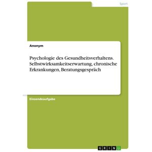 Brand : GRIN Verlag, Binding : paperback, Edition : 1., Label : Psychologie des Gesundheitsverhaltens. Selbstwirksamkeitserwartung, chronische Erkrankungen, Beratungsgespräch, medium : paperback, numberOfPages : 24, publicationDate : 2024-05-31, languages : german, ISBN : 3389033017