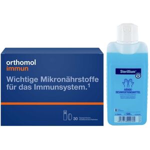 Anwendungsgebiet von Gemeinsam stark mit Orthomol und Sterillium (groß)Orthomol Immun Trinkfläschchen ist ein Nahrungsergänzungsmittel. Wenn das Immunsystem, z.B. nach Chemo- und Strahlentherapie, besonderen Belastungen ausgesetzt ist, ist der Bedarf an Mikronährstoffen, wie antioxidativen Vitaminen, Spurenelementen und sekundären Pflanzenstoffen in der Regel erhöht und kann durch die normale Ernährung dauerhaft nicht abgedeckt werden. Durch die gezielte Einnahme von orthomolekular zusammengesetzten Mikronährstoffen – wie in Orthomol Immun enthalten – kann das Immunsystem ernährungsphysiologisch günstig beeinflusst werden. Sterillium Lösung ist umfassend wirksam gegen Bakterien, Hefepilze und behüllte Viren. Zu den behüllten Viren zählen u. a. Influenzaviren (Influenza wird auch als echte Grippe bezeichnet.) Das Desinfektionsmittel ist besonders hautverträglich und rückfettend. Erhöht die Hautfeuchtigkeit bei regelmäßiger Anwendung. Ausgezeichnete Verträglichkeit auch bei Langzeitanwenadung. Hervorragende Sofortwirkung. Farbstoff- und parfümfrei. Sterillium Lösung - Hyygiene und Desinfektion für Zuhause. Bestens geeignet als Bestandteil der Hausapotheke. Hygienische und chirurgische Händedesinfektion zum Einreiben – unabhängig von Waschbecken und Wasser. Für alle Bereiche, in denen Hygienen relevant ist, wie z. B. im Gesundheitswesen und Industrie, in der häuslichen Kranken-, Alten- und Säuglingspflege, bei der Heimdialyse. Wirkstoffe / Inhaltsstoffe / ZutatenZusammensetzung von Orthomol Immun Trinkfläschchen: Inhalt: 30 Trinkfläschchen zu je 20 ml (23 g) plus 2 Tabletten (0,9 g) = Gesamtfüllmenge 717 g Mit Zucker und Süßungsmitteln. Zusammensetzung pro Tagesportion / pro 100 g Brennwert / Energie 122 kJ (29 kcal) /508 kJ (121 kcal) Fett, davon < 0,1 g / < 0,1 g gesättigte Fettsäuren < 0,1 g /< 0,1 g Kohlenhydrate, da