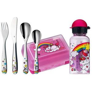 Inhalt: 1x Gabel, 1x Messer, 1x Löffel, 1x kleiner Löffel (L 16,5/18,5/16,5/13,0 cm), 1x Trinkflasche (0,4 l), 1x Brotdose - Artikelnummer: 1286059980 Material: Cromargan Edelstahl 18/10 poliert. Rostfrei, formstabil, hygienisch, säurefest und unverwüstlich. Kindergeschirr aus spülmaschinengeeignetem Porzellan. Die bunten Motive sind kratzbeständig, lebensmittelecht und farbecht Das Kindermesser hat einen leichten Wellenschliff. Der Laffenrand des Löffels hat abgerundete Kanten, und die kurzen stumpfen Zinken der Kindergabel passen sich kleinen Kindermündern an Für Kinder ab 3 Jahren: das vollständige Besteck-Set steht dem der Großen in nichts nach und eignet sich bestens zum selbständigen Essen. In altersgerechter Größe und Form. Ergonomisch auf kleine Kinderhände angepasst Alle WMF Kinderbestecke lassen sich gravieren