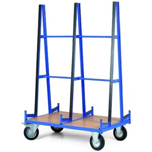 Das Fahrgestell ist zum Transport von Plattenmaterial geeignet. Die Wagenkonstruktion ist so gewählt, dass es nicht zum Abrutschen des Plattenmaterials kommen kann, sie ist aus Stahlprofilen hergestellt, die Stützträger für das Material sind mit Kunststoffschutz versehen. Die Metallteile sind mit RAL 5005 pulverbeschichtet. Die Räder verfügen über einen Durchmesser von 200 mm. Eigenschaften: Konstruktionsfarbe: blau, Tragfähigkeit (kg): 600, Griffhöhe (mm): 1600, Regalbodenmaße B x L (mm): 800 x 1200, Raddurchmesser (mm): 200, Maße H x B x L (mm): 1600 x 800 x 1200, Radtyp: schwarze Gummilauffläche