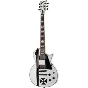 ESP Iron Cross SW, Single cut E-Gitarre; James Hetfield Signature Modell; Korpus: Mahagoni; Decke: Ahorn; Hals: Mahagoni; Griffbrett: Makassar Ebenholz; Halsbefestigung: geleimt; Halsprofil: Thin U; 22 Extra Jumbo Bünde; Sattelbreite: 42 mm (1,65"); Mensur: 629 mm (24,75") - 350 mm-13,78"); Schlagbrett: Schwarz; Tonabnehmer: Active EMG JH SET (Steg) - Active EMG JH SET (Hals); Regler: 2x Volume, 1x Tone; Schalter: 3-Wege Toggle; Steg: Tonepros Locking TOM & Tailpiece; Hardware Oberfläche: Schwarz; Mechaniken: LTD Locking; inkl. Koffer; Farbe: Snow white with black stripes; Originalbesaitung: D'Addario XL110 (.010-.046)