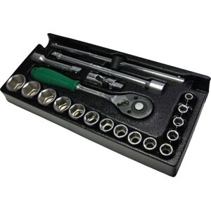 Anzahl Einsätze/Schubladen: 1+1+1 [3] / 1; G+F; type F. Anzahl der Werkzeuge: 23. Buchsengröße [Zoll]: 1/2. Einsatztyp: Kunststoff. Einsätze Größe [mm]: 190x380. Hersteller: HANS. Herstellernummer: TT-16. Index: TT-16. Kappengröße [mm]: 8; 10; 11; 12; 13; 14; 15; 16; 17; 19; 22; 24; 27; 30; 32. Profil: 6-Kant. Werkzeugtyp: Buchse/Sechskant; Erweiterung; Gelenk; Knopf; Rassel.