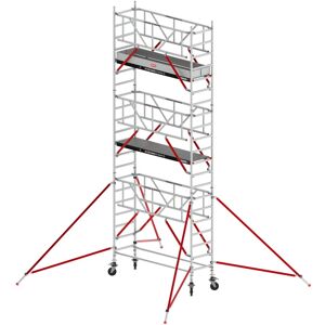 RS TOWER 51-S Fahrgerüst mit 75 cm Rahmen mit Safe-Quick - Das System mit zahlreichen Anwendungsmöglichkeiten. Bis zu 10,2 m Arbeitshöhe Fahrgerüst schmal, für schmale Räume Mit allen Komponenten der RS TOWER 5-Serie kombinierbar Leichtgewicht Fiber-Deck®-Plattformen oder Holzplattformen Mit Safe-Quick® Geländer Das RS TOWER 51 ist ein Fahrgerüst, worauf man bauen kann, sowohl im Innen- als auch im Außenbereich. Das System kann mit allen Komponenten der RS TOWER 5-Serie erweitert werden. Außerdem kann das Gerüst mit anderen Anwendungen wie beispielsweise einem Laufsteg oder einer Verbreiterungskonsole verbunden werden. Damit ist Ihr Gerüst nicht nur stabil und sicher, sondern auch sehr flexibel. Fahrgerüst schmal, für schmale Räume Schmale Fahrgerüste haben einen Rahmen von 0,75 oder 0,90 Metern. Das heißt, dass auf jeder Ebene eine Plattform liegen kann. Schmale Gerüste eignen sich somit hervorragend, wenn wenig Platz zur Verfügung steht. Konfigurieren und kombinieren Das Fahrgerüst-System kann mit Komponenten aus der RS TOWER 5-Serie erweitert werden und kann mit anderen Anwendungen wie zum Beispiel einem Laufsteg oder einer Verbreiterungskonsole kombiniert werden. Immer sicher mit Safe-Quick® Mit der Innovation Safe-Quick® GuardRail montieren Sie schon vor dem Betreten der Plattform ein verbleibendes Geländer. Dann sind Sie rundherum auf jedem Niveau geschützt. Starke Verbindungen Gepresste Verbindungen zwischen Klaue und Strebenrohr machen das RS TOWER 51 so stark. Die Verbindungen sind nicht geschweißt und sind sehr strapazierfähig. Holzplattformen oder Leichtgewicht-Plattformen Das System ist mit Holzplattformen oder mit Leichtgewicht-Plattformen lieferbar. Fiber-Deck® Plattformen sind 30% leichter und sorgen für einen schnelle und einfachen Auf- und Abbau. Integrierter Aufwähsicherung Mit unser innovative Plattformhaken baut man noch schneller auf und ab. Die Aufwähsicherung ist im einzigartigen Entwurf integriert. Weiterbauen möglich Mit unser RS Tower 5 ist es möglich um mehrere Gerüste zu kuppeln. So wird eine Große Arbeitsbühne kreiert, ohne Höhenunterschied zwischen die Plattformen, sehr praktisch und vor allem sehr sicher. Fest integrierte Sicherungsstifte Die Sicherungsstifte sind direkt am Rahmen befestigt. Sie befinden sich also immer an der richtigen Stelle und sind jederzeit griffbereit. Jedes Bauteil ist austauschbar Alle Bauteile können unabhängig voneinander ausgetauscht werden. Schnell bestellt, schnell geliefert und daher wieder schnell einsatzbereit. Doppelstopp-Lenkrollen Mit den Doppelstopp-Lenkrollen steht Ihr Fahrgerüst sicher und stabil an einer Stelle. Die Bremse kann leicht von Hand gelöst werden. Die Lenkrollen sind bis zu 25 cm höhenverstellbar (spindelbar). Ihr RS TOWER, Ihre Identität Kennzeichnen Sie Ihr RS TOWER mit den Farben Ihres Unternehmens. Dann sind Sie auf jedem Niveau sichtbar und erkennbar.