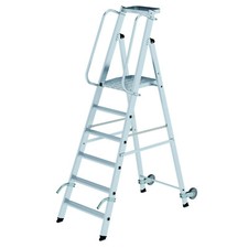 Treppengängige Stufen-Stehleiter, beidseitig begehbar. aus Aluminium 80 mm tiefe, geriffelte Stufen 4-fach gebördelte Stufen-/Holmverbindung Konische Holmführung für einen sicheren Stand Vier Holmverlängerungen mit solider Schiebeführung, stufenlos per ergonomischem Sterngriff verstellbar Außenliegender Verstellmechanismus / Sterngriff für sicheres Begehen der Leiter ohne Stolperfalle nivello®-Leiterschuhe mit patentierter 2-Achsen-Neigungstechnik Optional mit Trittauflagen clip-step und clip-step R13 ausrüstbar Stufenabstand: 235 mm Maximale Belastung: 150 kg Stabile Verarbeitung für anspruchsvolle Einsätze (u.a. 4-fach-Bördelung) Korrosionsbeständige Beschläge Einsatz von hochwertigen und hochfesten Materialien Vielfältiges und praktisches Zubehör