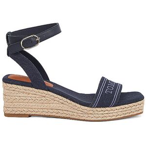 Damen Pantolette Fesselriemchen mit Dornschließe Bastumrandeter Keilabsatz Rutschhemmende Laufsohle Dezent gepolsterte Innensohle Plateauhöhe ca. 2cm Absatzhöhe ca. 6cm Farbbezeichnung: Blue Obermaterial: Textil Innenmaterial: Textil Sohlenmaterial: Synthetik